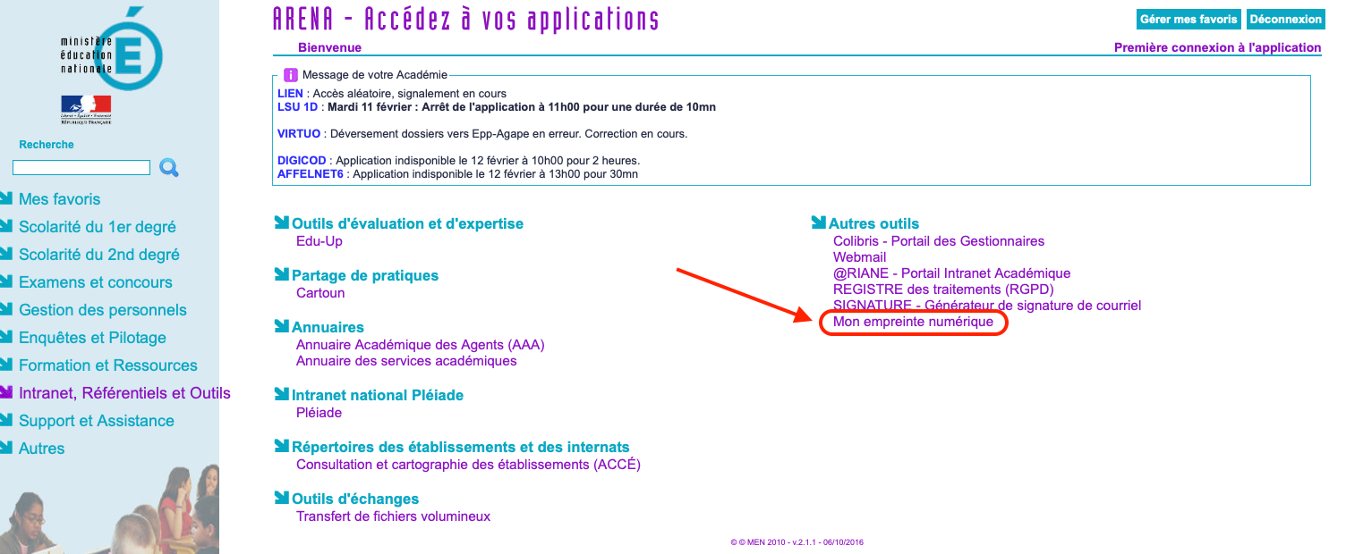 L’image est une capture d’écran d’une interface web du ministère de l’Éducation nationale français, intitulée ARENA - Accédez à vos applications. Il s’agit d’un portail utilisé par les agents de l’éducation pour accéder à différentes applications et services en ligne.