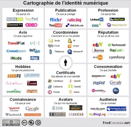 Fred Cavazza, auteur et conférencier, a ainsi cartographié l’identité numérique en recoupant toutes les traces que nous pouvons laisser sur internet.