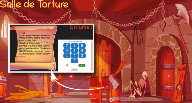 Interface du jeu représentant ici une salle de torture (dessin de upklyak sur Freepik) avec un visuel de la première énigme.
