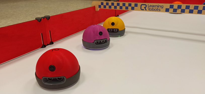 Trois robots (rouge, violet et jaune) en forme de demi sphère, sur un circuit. Un bandeau à damiers matérialise la ligne d’arrivée.