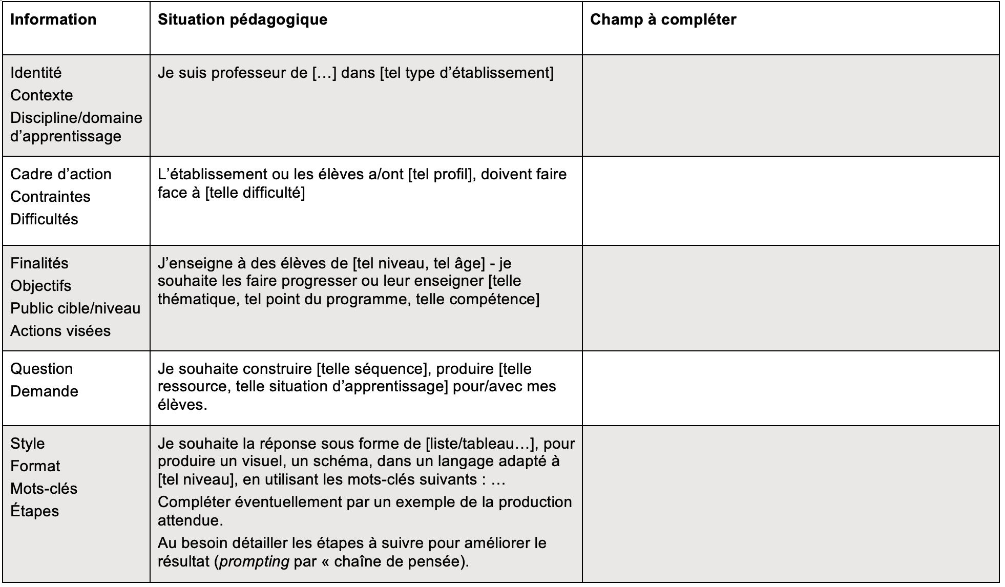 – Ligne 6 : Style, Format, Mots-clés, Étapes /// Je souhaite la réponse sous forme de [liste/tableau…], pour produire un visuel, un schéma, dans un langage adapté à [tel niveau], en utilisant les mots-clés suivants : …