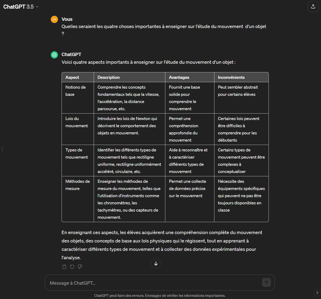 Réponse générée sous forme de tableau par ChatGPT 3.5 - Transciption