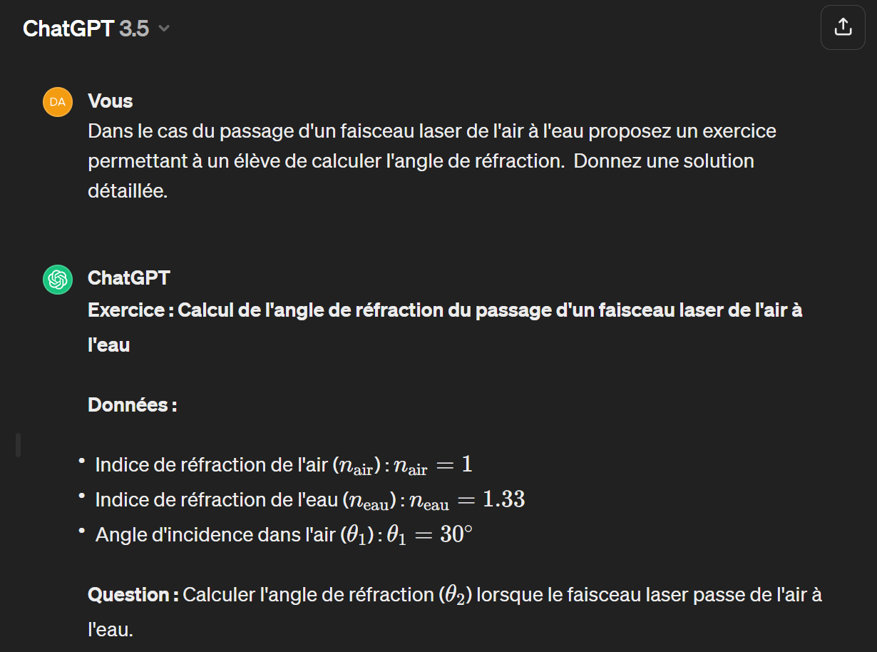 Dans le cas du passage d’un faisceau laser de l’air à l’eau proposez un exercice permettant à un élève de calculer l’angle de réfraction. Donnez une solution détaillée.