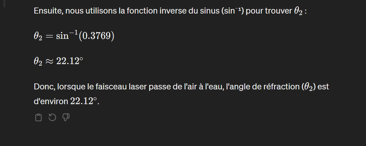 Donc, lorsque le faisceau laser passe de l’air à l’eau, l’angle de réfraction θ2 est d’environ 22.12∘.