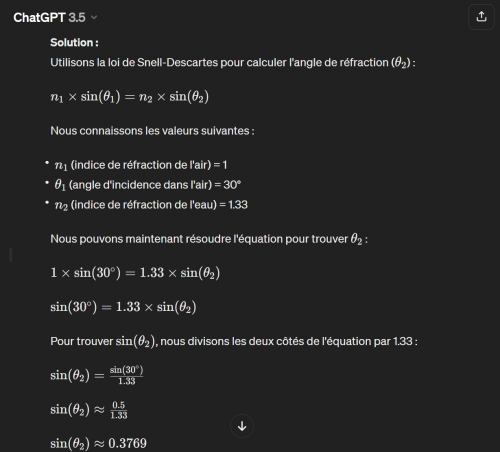 Solution : Utilisons la loi de Snell-Descartes pour calculer l’angle de réfraction :