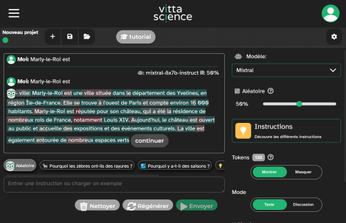 Afin d’illustrer concrètement cela, allons sur la plateforme IA générative de textes de Vittascience et demandons au « VittaBot » la suite de la phrase « Marly-le-Roi est ... ».