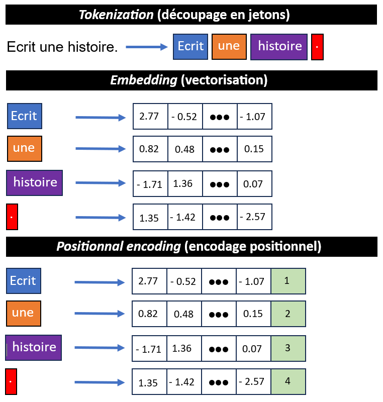 L’architecture du modèle « Transformer » [2] sur laquelle s’appuient les LLM autorégressifs permet de tenir compte du contexte dans lequel figure un mot. Elle fait intervenir préalablement un pré-traitement composé de trois étapes successives :