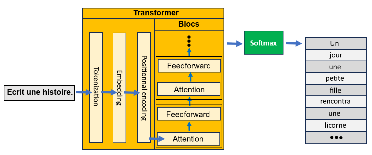 Le prompt subit préalablement un pré-traitement en 3 parties : tokenization (découpage en jetons), embedding (vectorisation des jetons) et enfin positionnal encoding (encodage positionnel des jetons). Des blocs empilés composés de deux parties (attention et feedforward) alimentent un réseau de neurones appelé softmax fournissant en sortie un texte cohérent tenat compte du contexte du prompt.