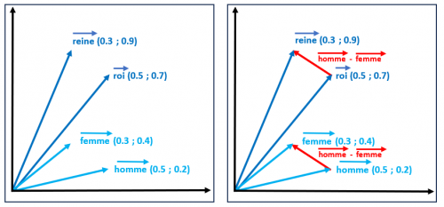 La vectorisation permet de capturer des relations sémantiques complexes dans l’espace vectoriel, en utilisant des opérations algébriques simples, telles que des additions et des soustractions, sur les vecteurs de mots. Par exemple si on demande à une IA générative d’indiquer le résultat de roi + (homme - femme) la réponse fournie sera le mot reine. Cela est assez facile à comprendre lorsque l’on réalise les constructions géométriques sur les vecteurs associés aux mots précédents. Remarquons en particulier que la soustraction vectorielle homme - femme permet d’extraire la différence sémantique entre ces deux mots à savoir le genre.