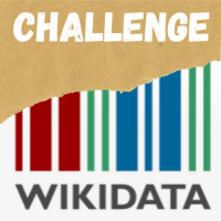 Cette image représente le logo du challenge Wikidata. Il est composé d’un code barre de couleur sur lequel se superpose un morceau de kraft déchiré avec marqué "challenge". En dessous est inscrit "Wikidata"