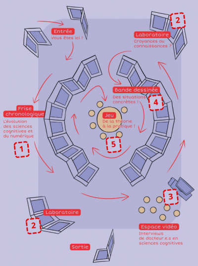 Entrée 1. Frise chronologique 2. Laboratoire 3. Espace vidéo 4. Bonde déssinée 5. Jeu