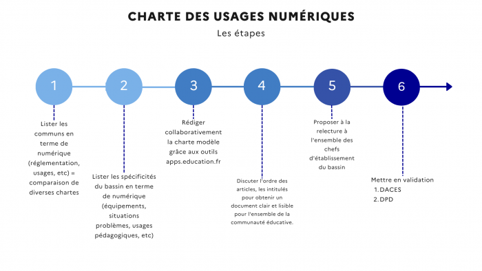 Les 6 étapes de la démarche de projet pour concevoir un modèle de charte numérique :