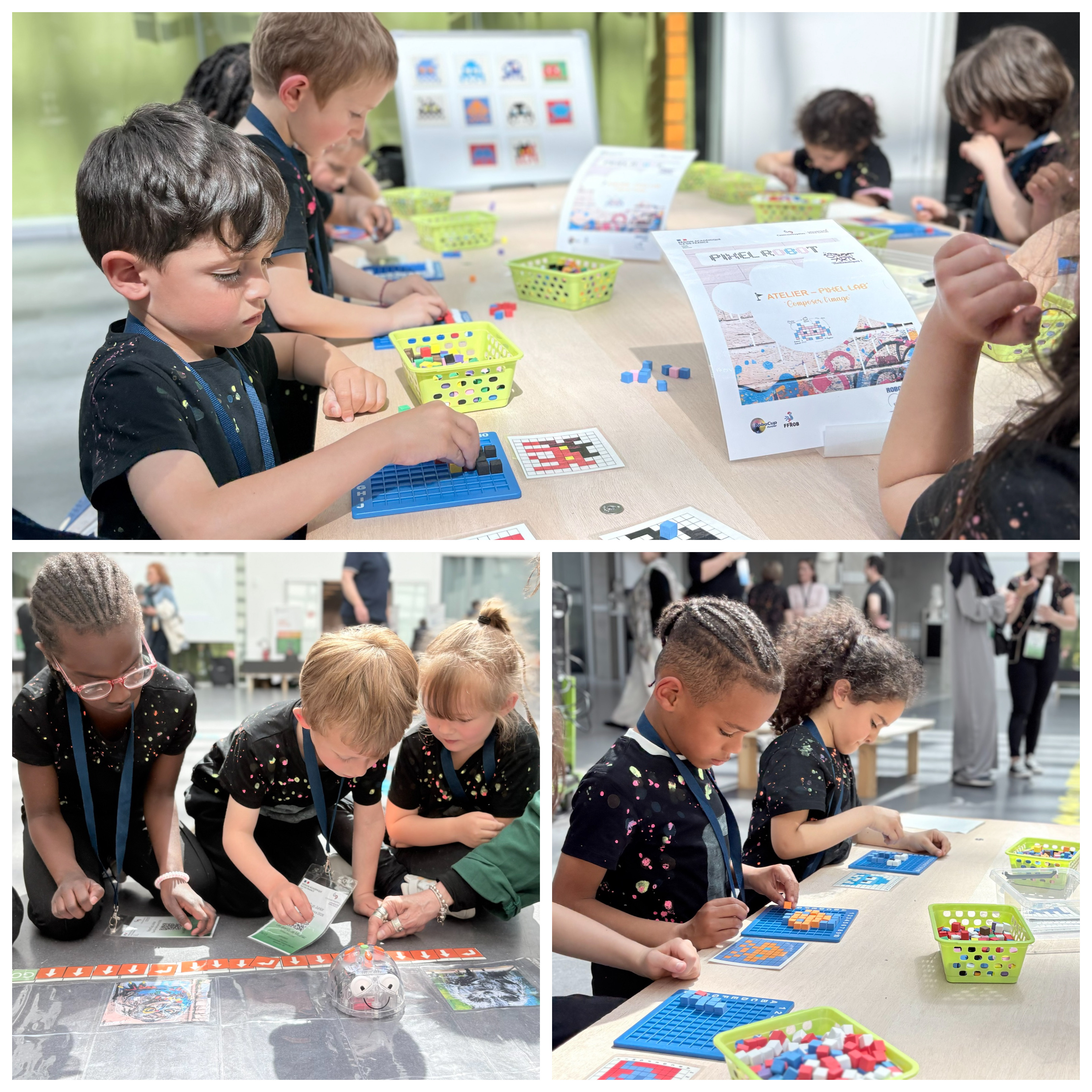 - L’atelier « Pixel Lab’ – Composer l’image » a favorisé la reproduction de modèles, l’organisation de l’espace et la transition entre le code et l’image, en utilisant des grilles et des outils numériques comme Pixabloc ou Pixelo. Ces activités, adaptées aux cycles 1, 2 et 3, ont permis aux élèves de mobiliser simultanément des compétences en mathématiques, en logique algorithmique et en création artistique, tout en renforçant leur esprit de coopération et leur créativité.