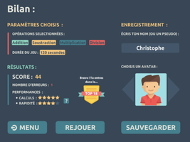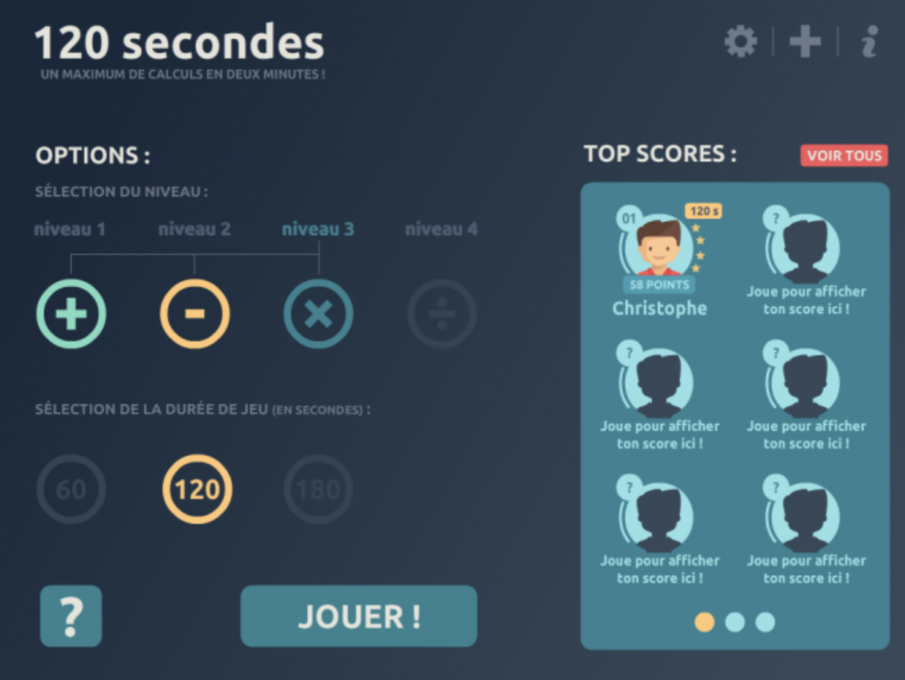 120 secondes est un exerciseur en mathématiques, portant sur les 4 opérations, disponible sur tablette. Le but du jeu est de répondre correctement à un maximum de calculs en 2 minutes. À chaque fois que le score passe à la dizaine supérieure, le niveau augmente et les calculs sont un peu plus compliqués (apparition de la division, nombres plus grands, etc.).