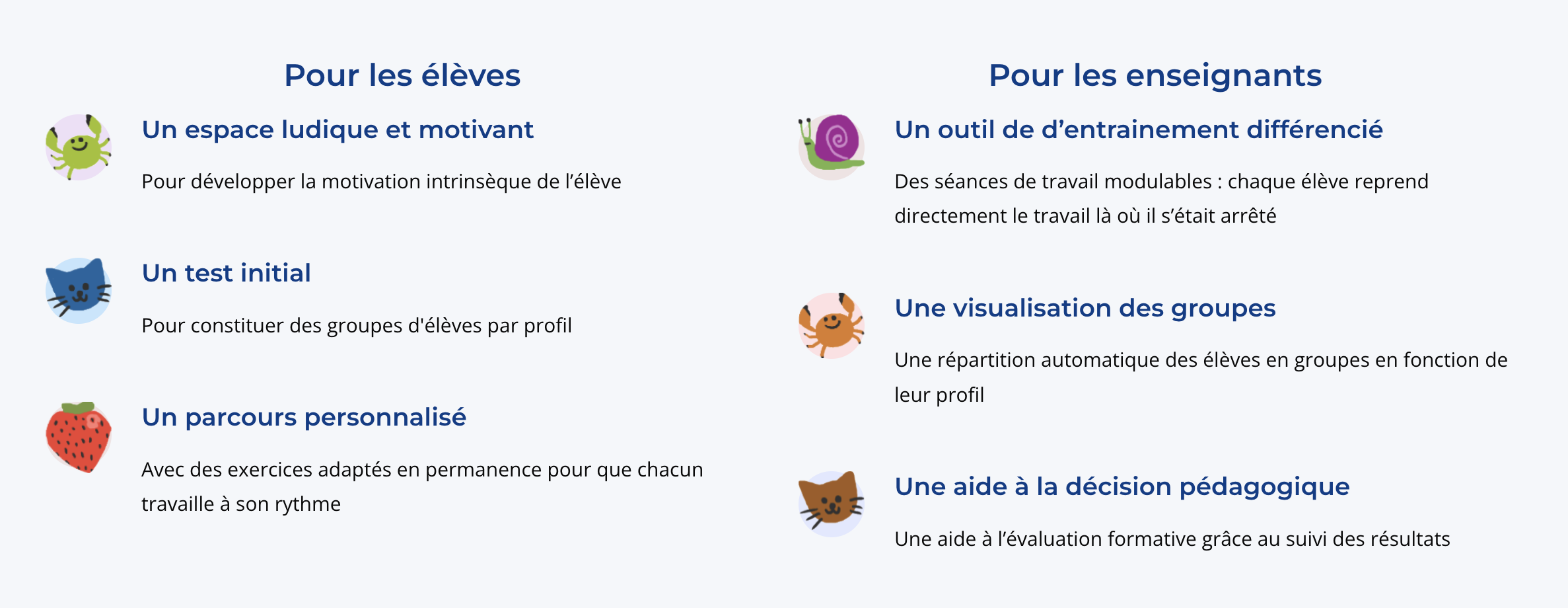 Adaptiv’Math est un assistant pédagogique pour l’enseignement et l’apprentissage des mathématiques pour les enseignants et leurs élèves du cycle 2 (CP, CE1, CE2).