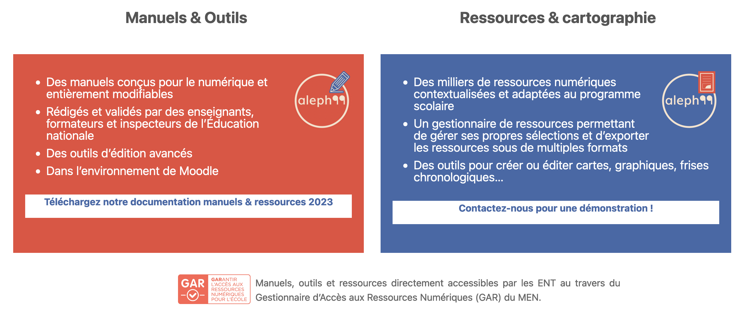 Aleph99 manuels et ressources est disponible pour tous les lycées en Ile De France via le GAR de l’ENT de l’établissement et recouvre les programmes d’histoire-géographie de la seconde à la terminale. Aleph99 est composé de 2 parties :