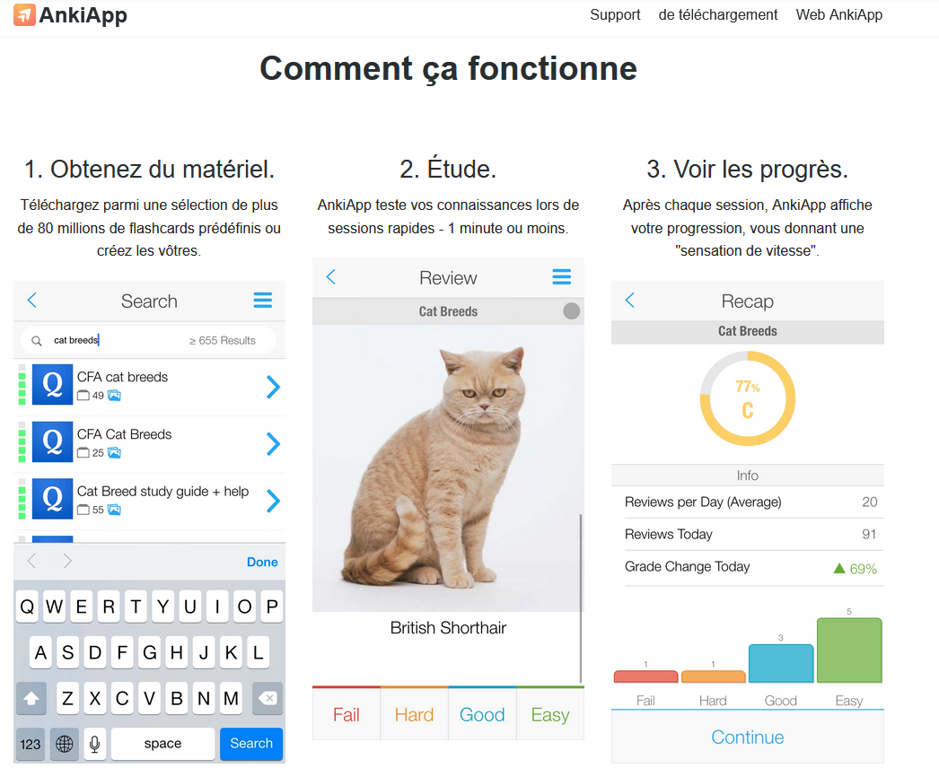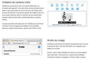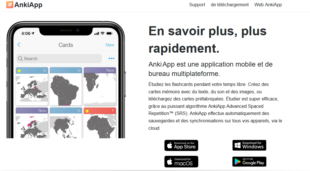 AnkiApp est une application qui vous permet de créer des flashcards, c’est à dire des cartes de mémorisation. Vous pourrez en intégrant du texte, du son et des images. Le principe est de poser une question sur le verso de la carte et la réponse sur le recto. Cette application vous donnera également un suivi sur vos résultats et possède un algorithme qui vous proposera les cartes que vous connaissez le moins en premier.