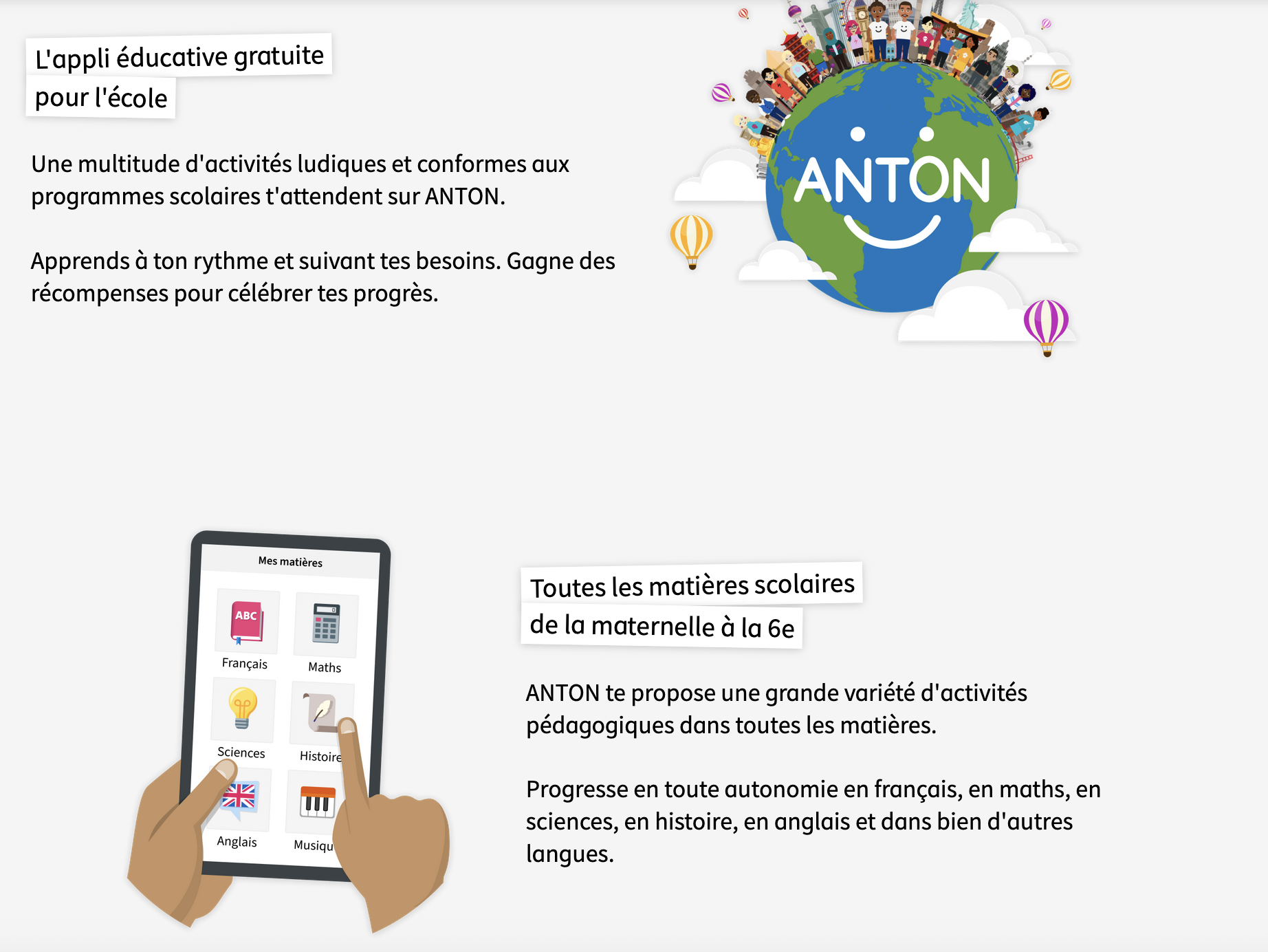 ANTON se distingue par son approche ludique et interactive. Les élèves progressent à travers des exercices variés, présentés sous forme de parcours gamifiés avec des récompenses, ce qui favorise leur motivation et leur engagement. Chaque activité est construite en lien avec les programmes scolaires, permettant un usage en classe comme à la maison.