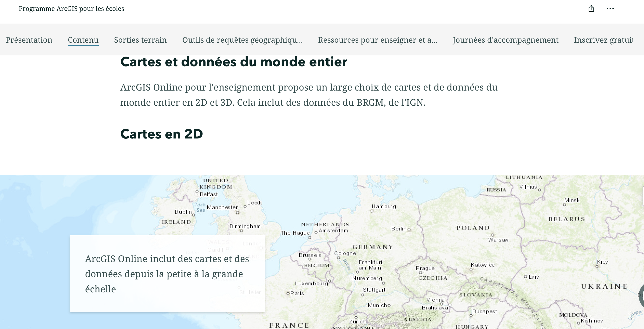 ArcGIS propose des solutions numériques liées à l’enseignement de géographie. Elles permettent à l’enseignant de disposer de cartes 2D, 3D du monde entier avec multitude d’options comme des cartes thématiques à partir de nombreux indicateurs. Vous pouvez également collecter des points GPS, des photos prises durant votre sortie pour créer un storyboard.