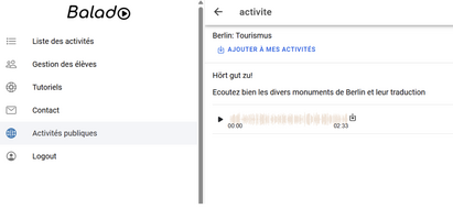 Balado est une ressource simple d’accès et adaptée à une grande variété de niveaux (de l’école élémentaire au lycée). Elle s’inscrit pleinement dans une pédagogie active qui met l’oral et l’écoute au cœur des apprentissages, tout en facilitant l’engagement des élèves et la différenciation des parcours.