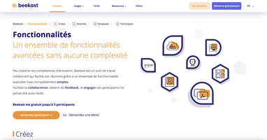 Beekast est une plateforme de réunion en ligne qui propose des outils de création, d’animation, d’analyse et de participation. Elle permet notamment de mettre en place des visioconférences, mais aussi de diffuser des quiz, des documents et des vidéos, et fournit en outre des comptes-rendus de session ainsi que des statistiques permettant d’évaluer les résultats des participants et la réussite de la session.