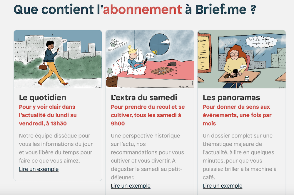 Ce document présente les trois formats d’information inclus dans l’abonnement à Brief.me, chacun illustré par un dessin et accompagné d’un descriptif.