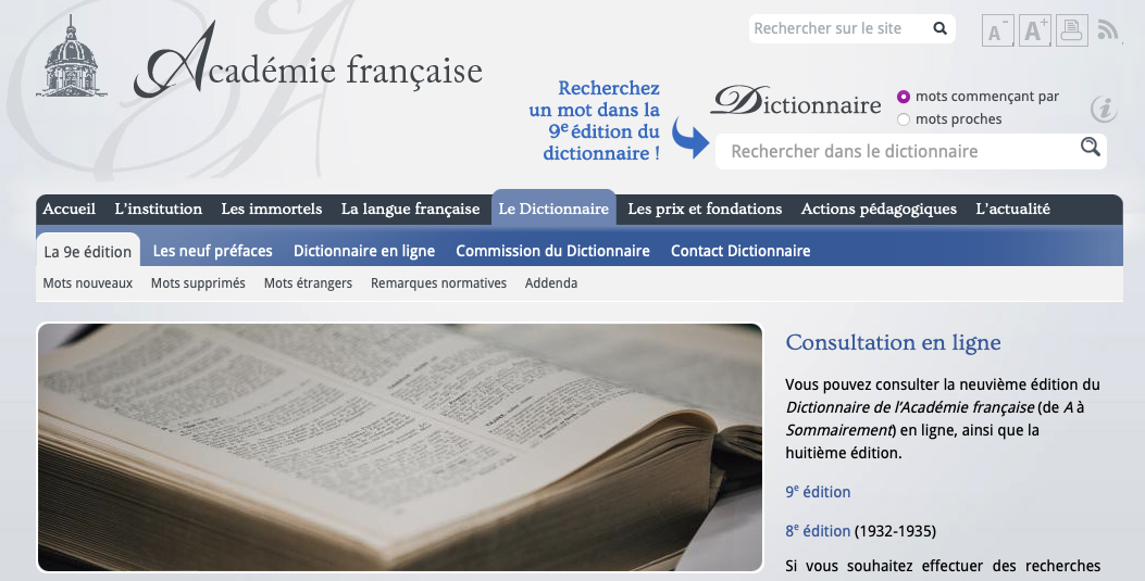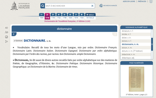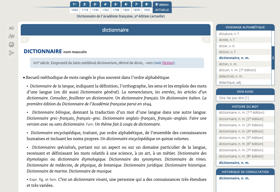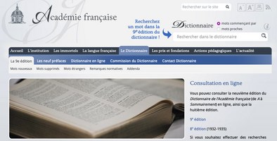 Dans le cadre de ses travaux de rédaction de la neuvième édition de son Dictionnaire, qui doivent arriver à leur terme au cours de l’année 2023, l’Académie française a souhaité rendre accessible le contenu de ce dictionnaire au plus grand nombre, sans attendre la publication du dernier tome chez Fayard, en se dotant d’un portail numérique qui comprend l’ensemble des éditions du Dictionnaire de l’Académie française, de la 1re édition de 1694 à l’édition actuelle, regroupant environ 60 000 entrées.