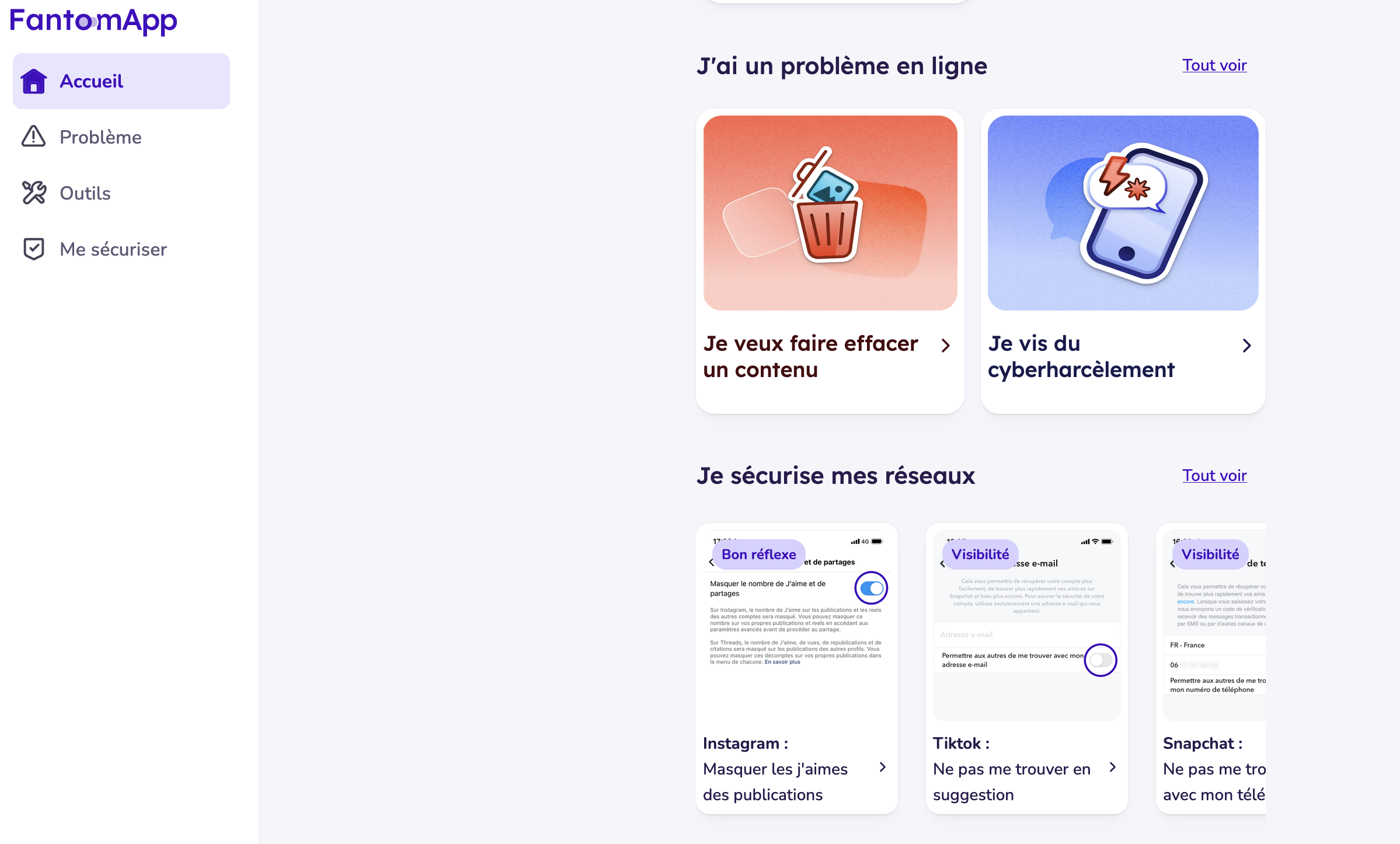 - des tutoriels guidés qui montrent comment ajuster les paramètres de confidentialité sur différents réseaux sociaux (Instagram, TikTok, Snapchat, X, WhatsApp, etc.) afin de préserver sa vie privée.