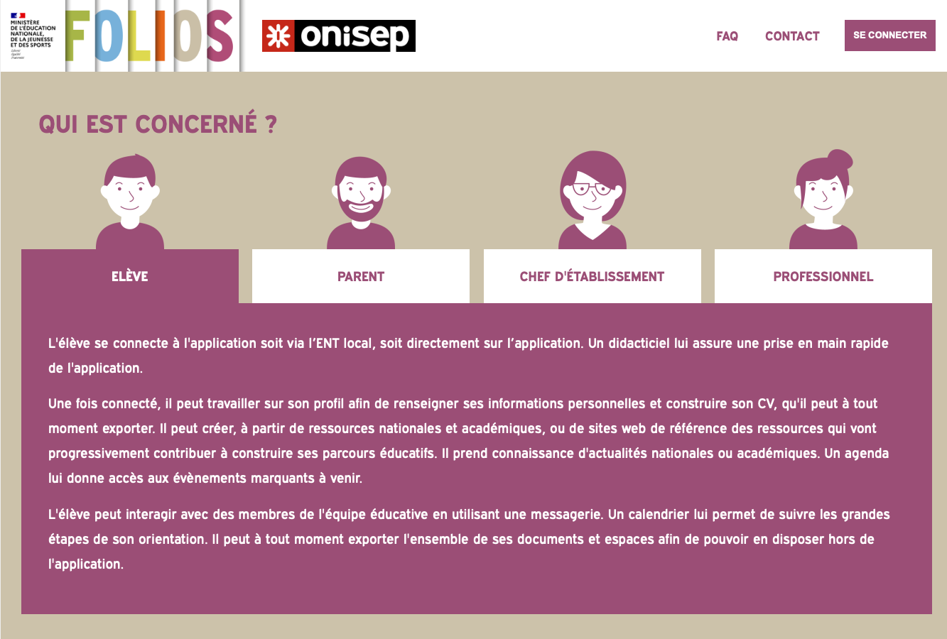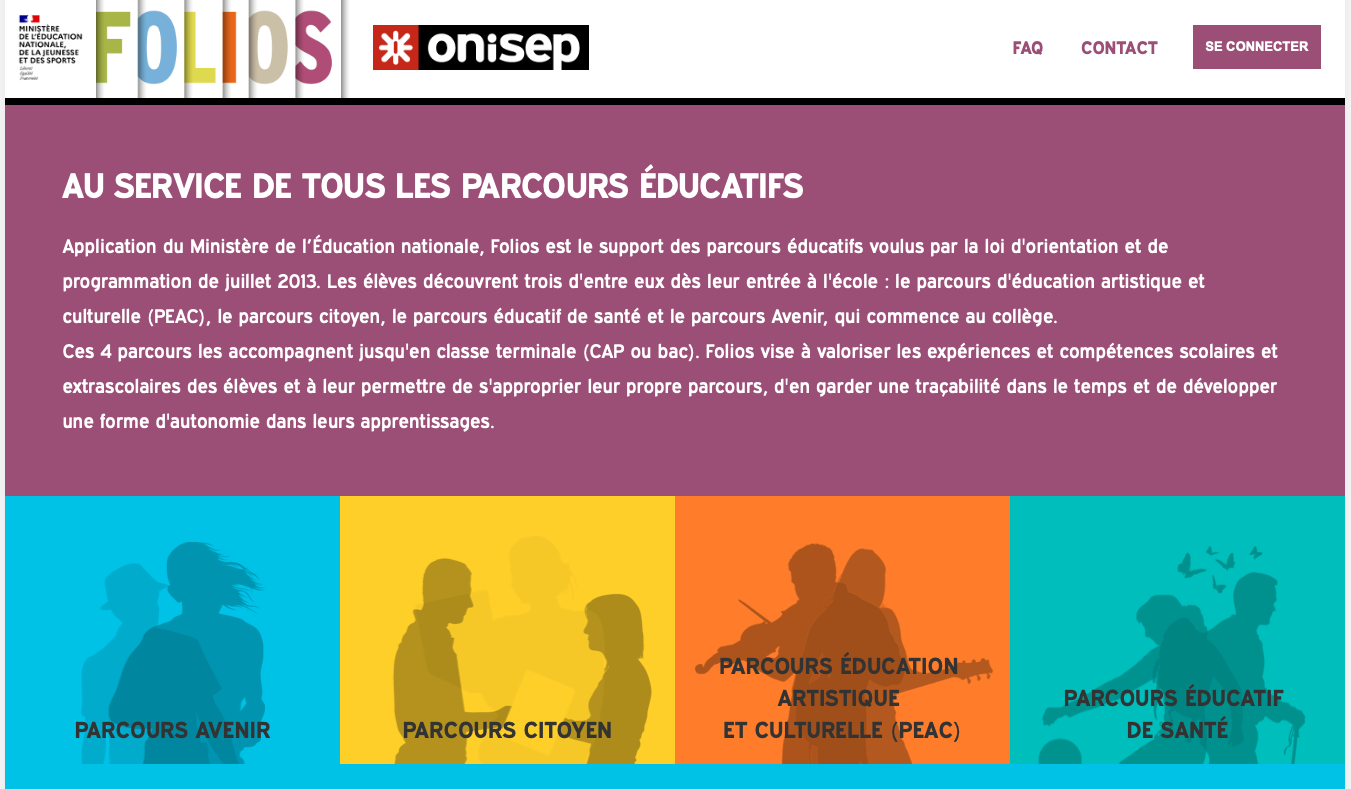 Folios est une application du Ministère de l’Éducation Nationale, de l’Enseignement Supérieur et de la Recherche, qui est le support des parcours éducatifs voulus par la loi d’orientation et de programmation de juillet 2013. Elle est éditée par l’ONISEP.
