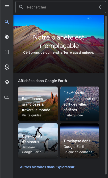 Parcourez les calques : routes, frontières, lieux, photos, et bien plus encore. Consultez la galerie Google Earth et découvrez des cartes incroyables : tremblements de terre en temps réel, avions en vol, chemins de randonnée, visites de villes, etc.