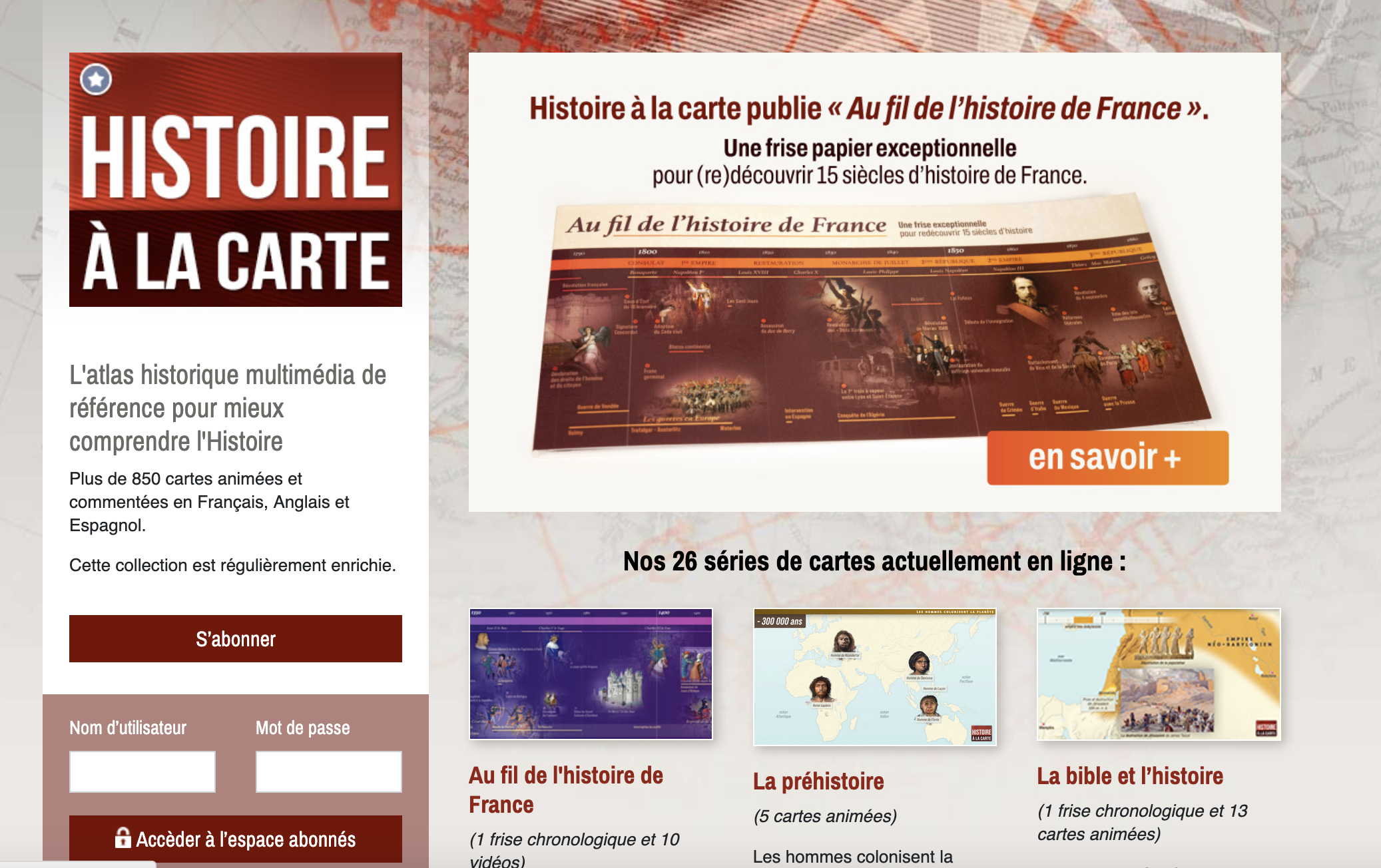 C’est un atlas historique multimédia qui propose plus de 850 cartes animées et commentées en plusieurs langues. Il permet aux enseignants et aux élèves d’explorer l’Histoire de façon dynamique grâce à des frises pédagogiques interactives. Utilisable en classe, au CDI ou à la maison, cet outil fiable est validé par des historiens. Accessible sur ordinateur, tablette et smartphone, il est compatible avec le GAR et e-sidoc.