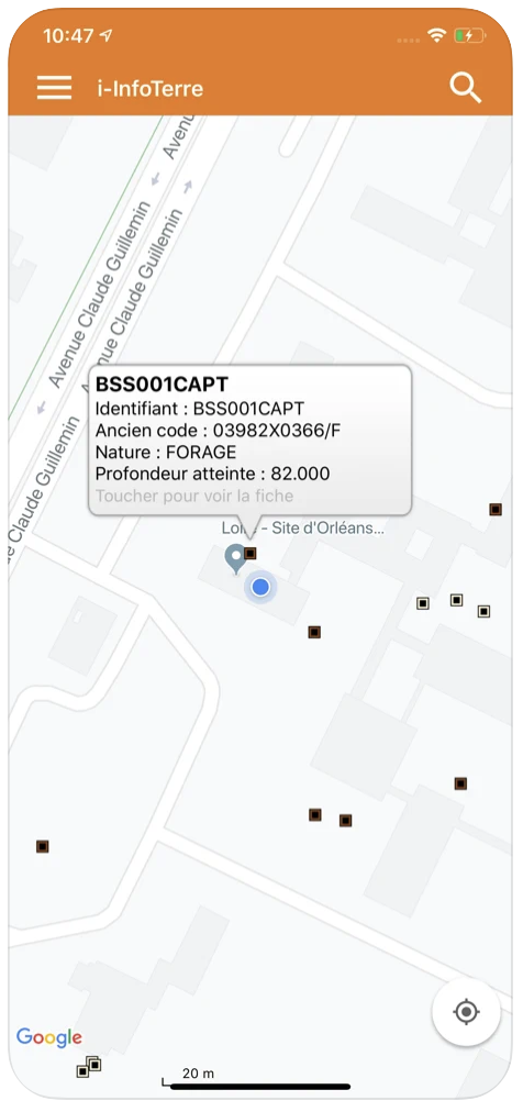 i-InfoTerre est le visualiseur de données géoscientifiques du BRGM. Il offre un accès cartographique en ligne à différentes couches thématiques : dossiers sur le sous-sol, forages d’eau, anciens sites industriels, mouvements de terrains, cavités souterraines et aléa retrait-gonflement. Plusieurs fonds de carte sont disponibles : orthophotos, plan mais aussi les cartes géologiques.