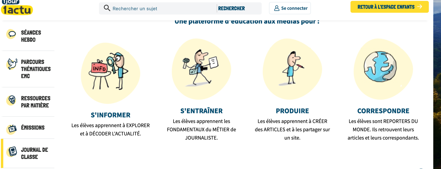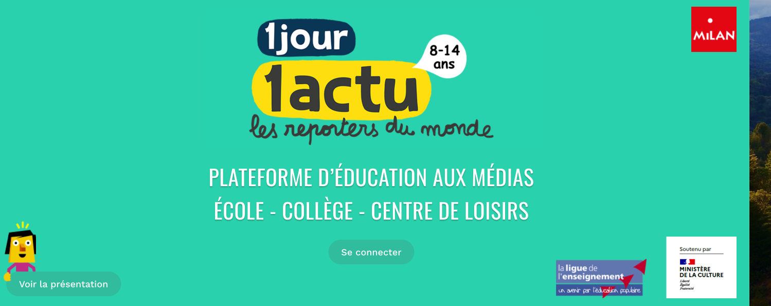 jour1actu, Les Reporters du monde est une plateforme internationale d’éducation aux médias et à l’information. Les élèves apprennent à s’informer, à s’entraîner et à produire de l’information. Les articles produits sont partagés avec des groupes de reporters à travers le monde. Les articles peuvent être regroupés sous la forme d’un journal de classe, pour une diffusion au sein de l’école ou auprès des parents.
