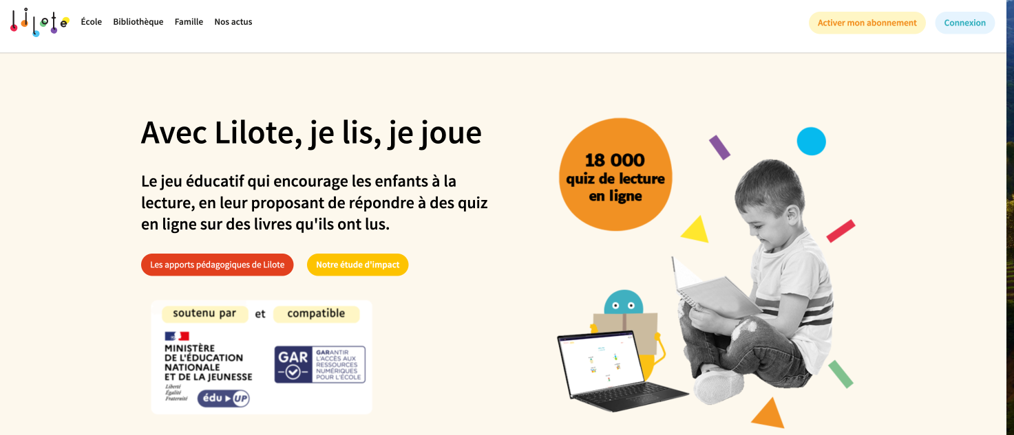Lilote est soutenue par l’Education nationale via le dispositif Edu Up et accessible via le Gestionnaire d’Accès au Ressources (GAR)