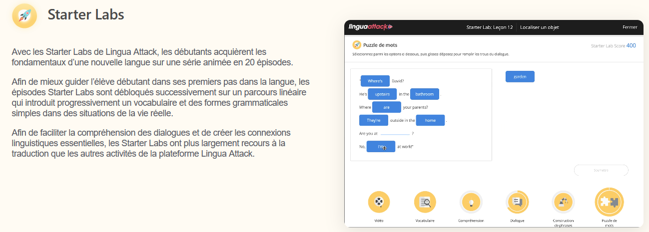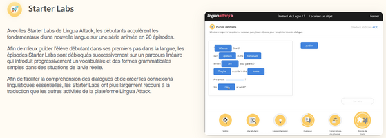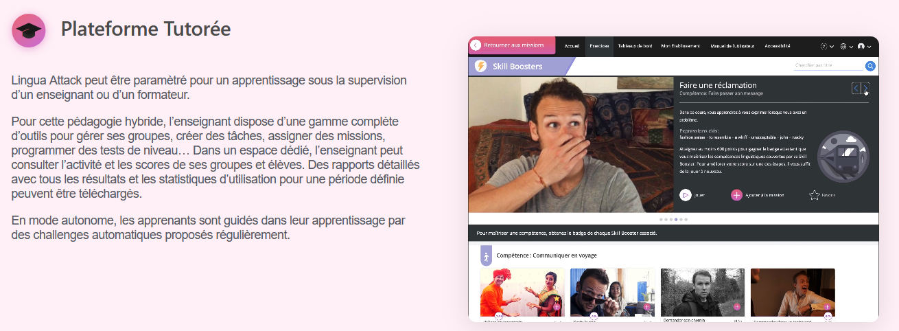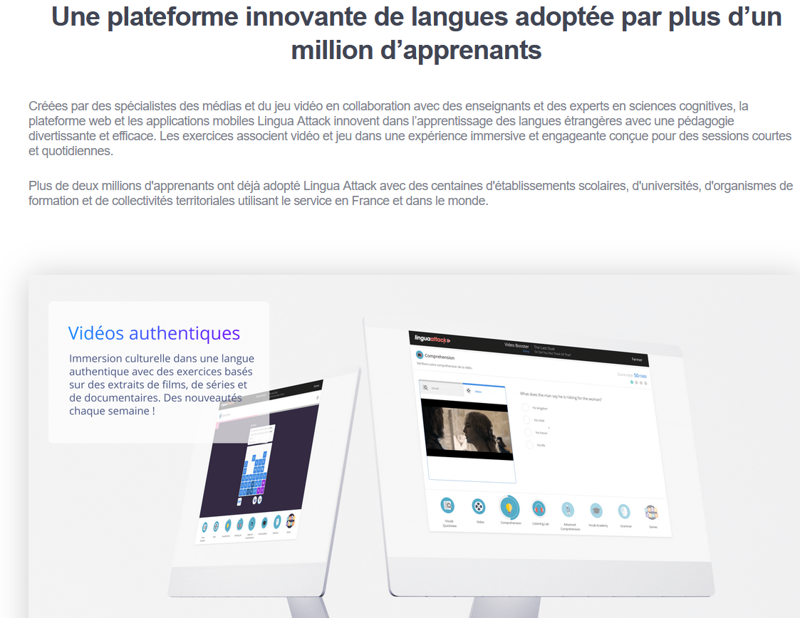 Lingua Attack est une plateforme permettant à l’apprenant de travailler les langues étrangères comme l’anglais, l’espagnol, l’allemand, le portugais et le chinois. Elle propose des vidéos adaptées et motivantes pour l’apprenant.