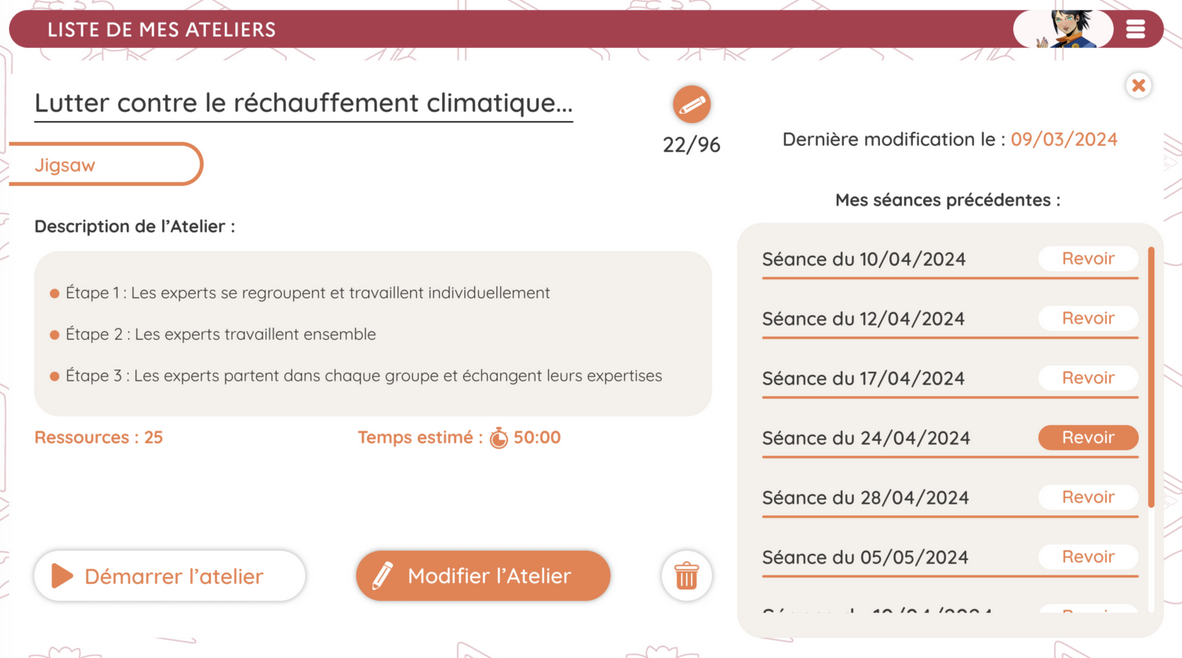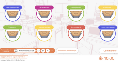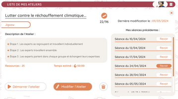 MAIA Atelier est une solution permettant aux professeur de gérer les ateliers des élèves depuis son ordinateur. En amont, les enseignants choisissent les modalités de l’atelier (comme l’atelier tournant, le café des savoirs, ou le puzzle des experts), chargent les ressources pédagogiques nécessaires (images, textes, audios, liens, PDFs), et définissent la séquence pédagogique (durée, objectif, notions à aborder).