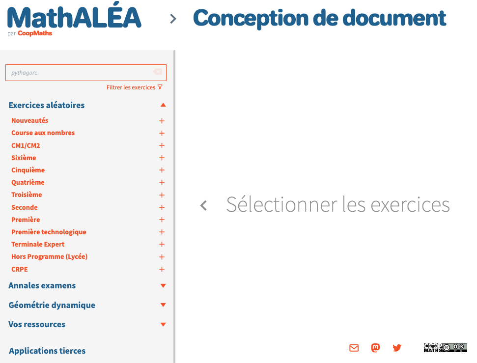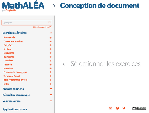 Le collectif d’enseignants de mathématiques du site Coopmaths.fr ont créé un générateur d’exercices MathALÉA. MathALÉA vous permet d’avoir accès à un grand nombre d’exercices classés par niveau, par chapitre et par thème.