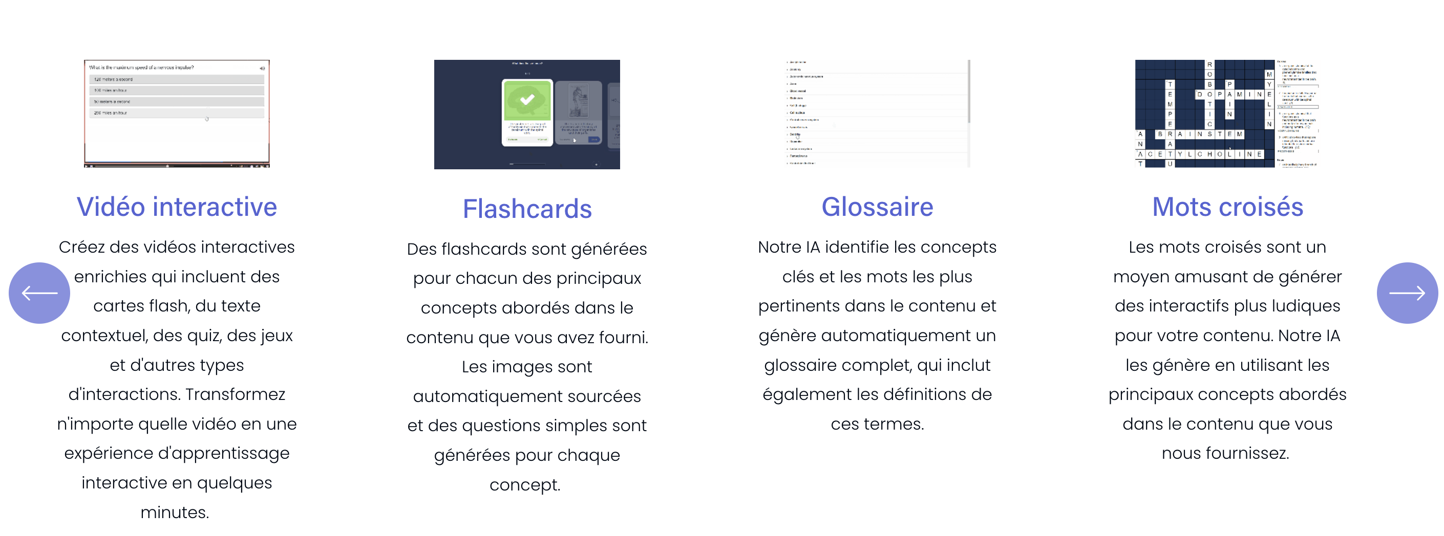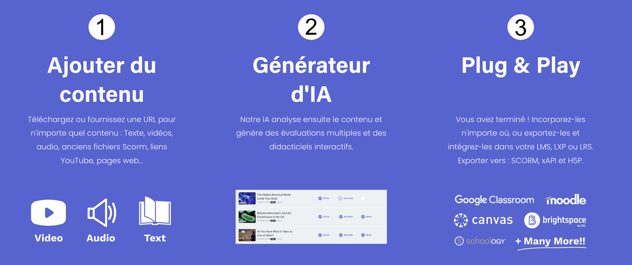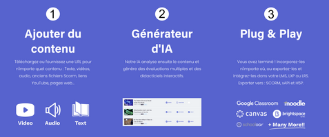 - L’IA analyse le contenu et génère des évaluations multiples et des didacticiels interactifs