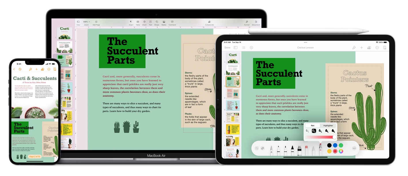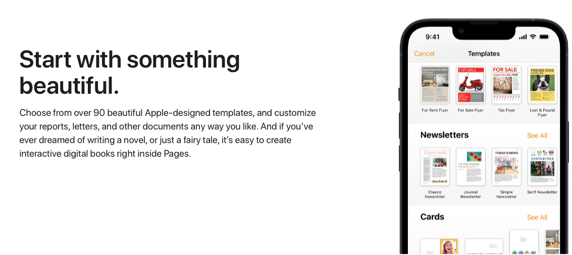 À mi-chemin entre Word et Publisher, Pages permet à la fois de créer des documents comme n’importe quel traitement de texte, mais également de composer des documents graphiques (affiches, invitations, flyers...)