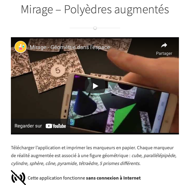 Les applications Mirage sont développées pour l’enseignement des mathématiques au collège. Celles-ci sont développées pour un usage en classe. Pour pouvoir utiliser cette application, vous devez au préalable télécharger et imprimer le jeu de marqueurs
