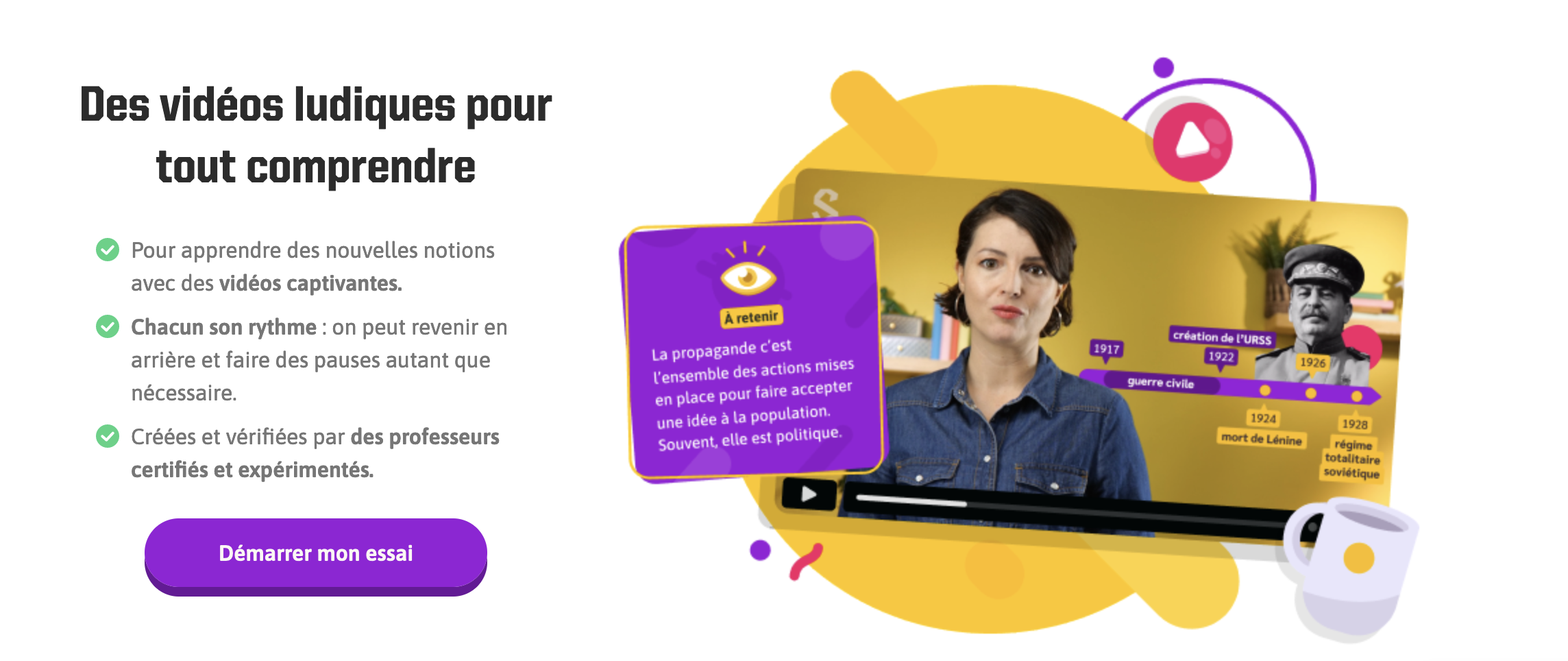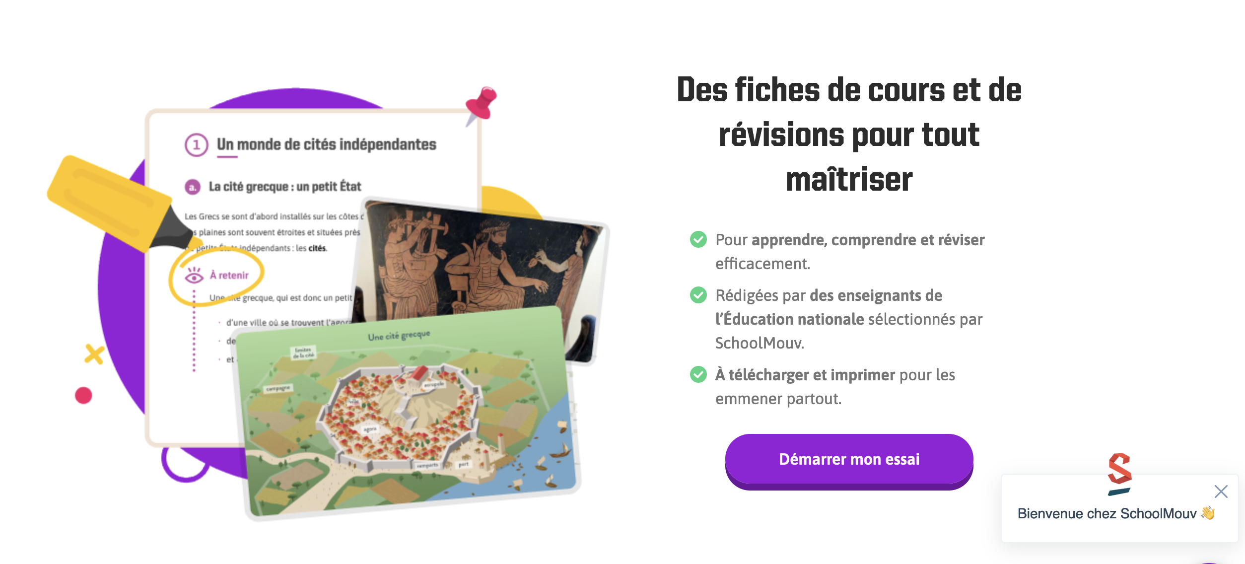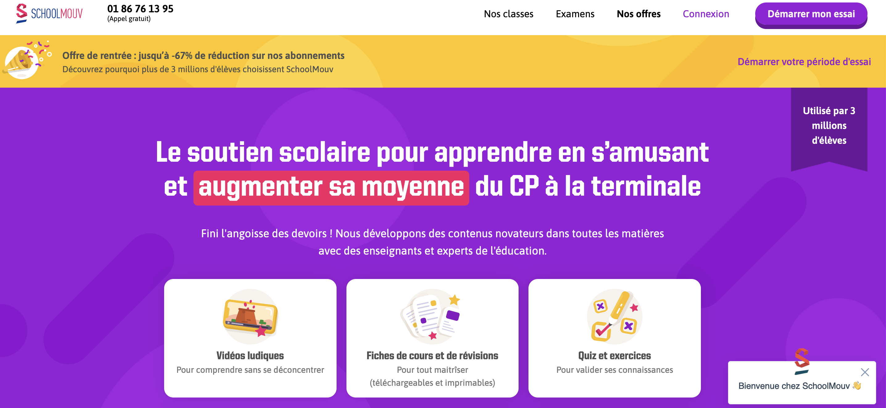 SchoolMouv est une plateforme proposant des contenus du CP à la Terminale afin d’aider les élèves à progresser dans leurs apprentissages. Ils pourront ainsi bénéficier de vidéos ludiques, de quizz, de fiches de révisions et de tchat avec des professeurs.