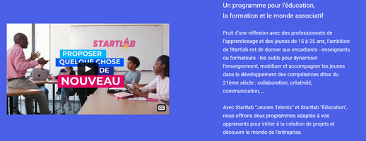 Startlab “Jeunes Talents” et Startlab "Éducation" offrent deux programmes adaptés pour initier à la création de projets et découvrir le monde de l’entreprise.