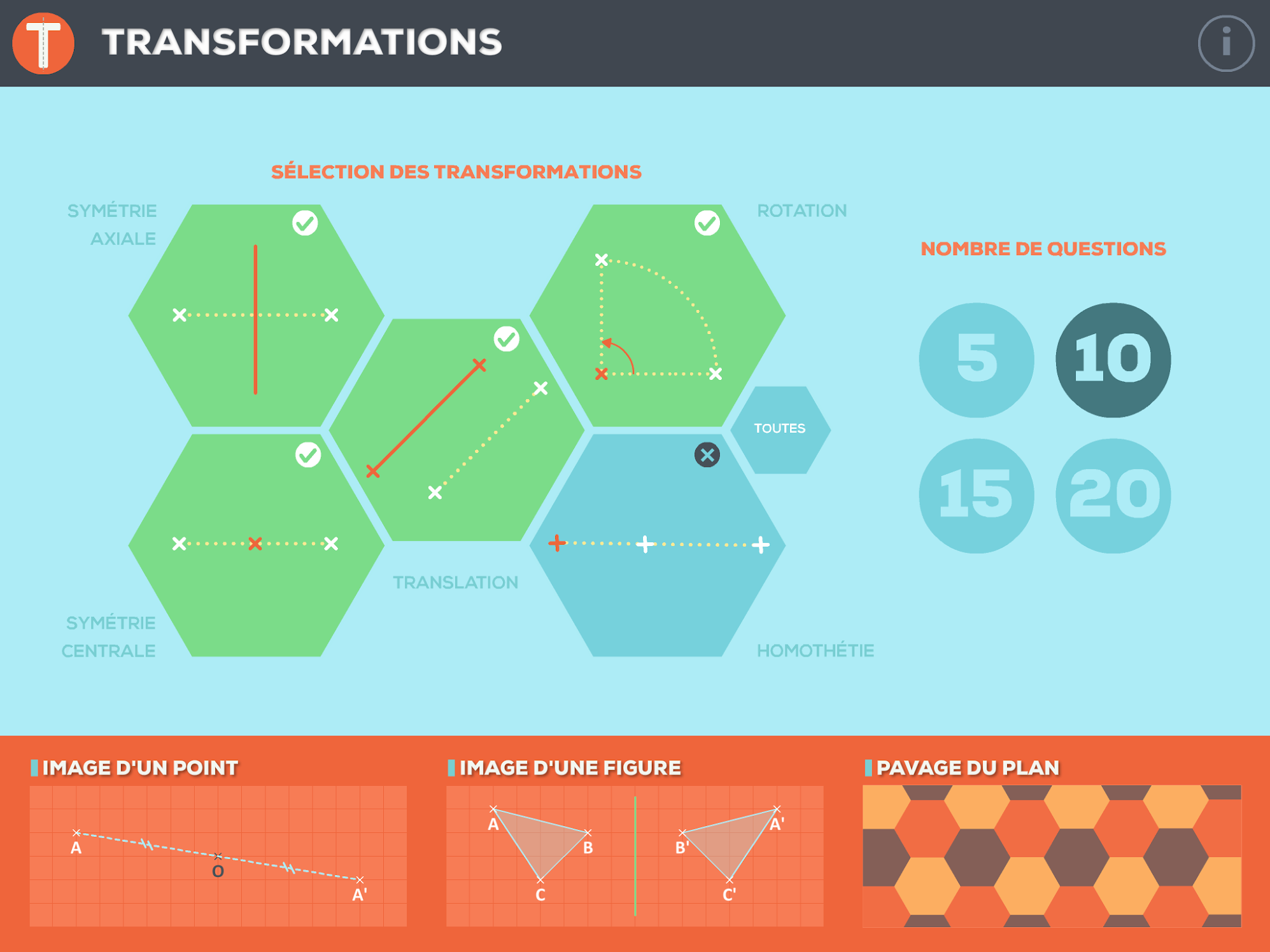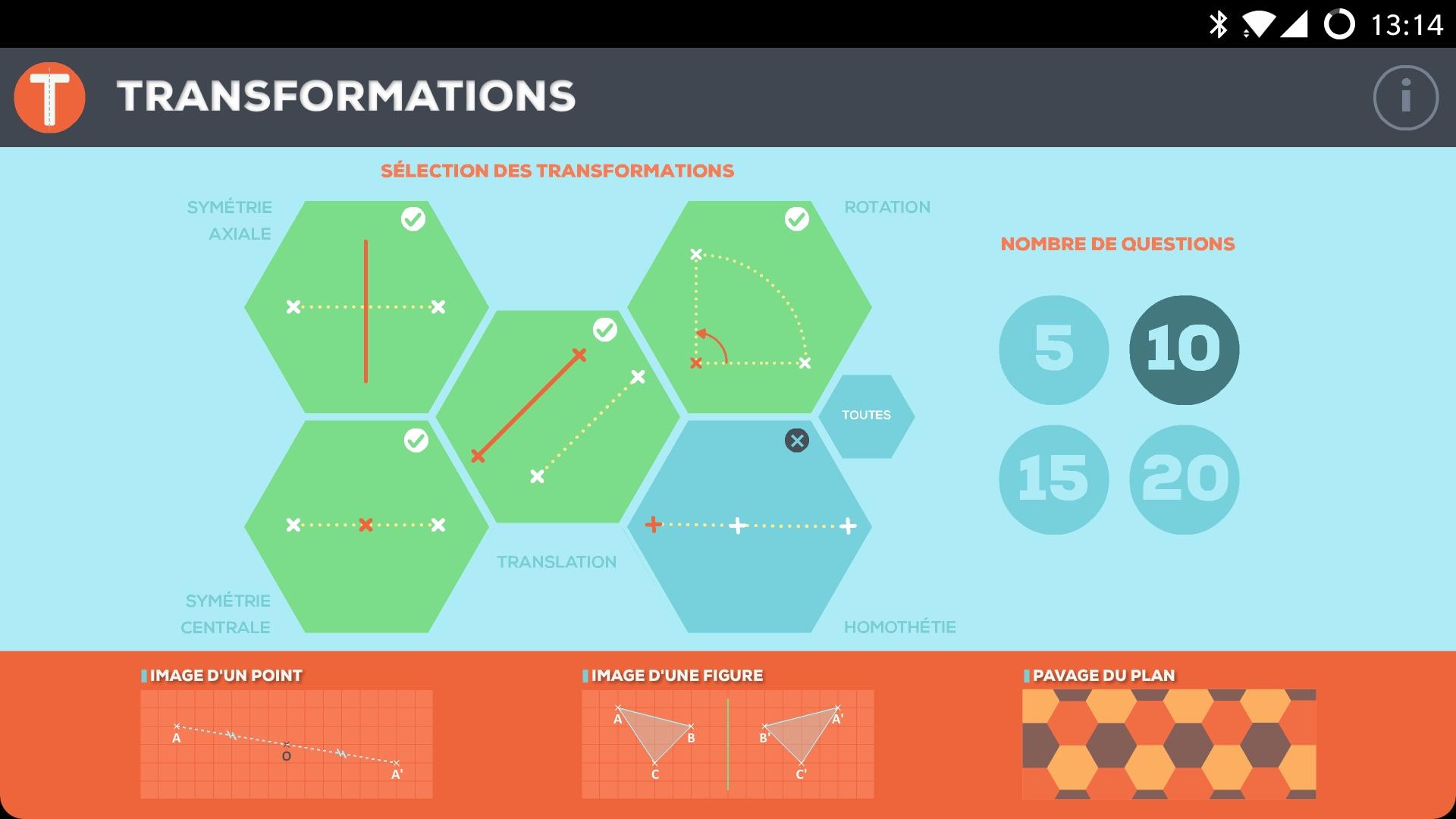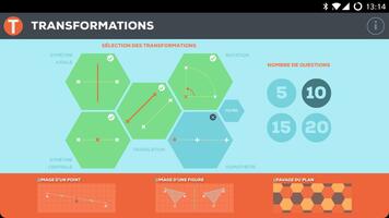 Transformations est un exerciseur portant sur les transformations planes étudiées au collège : Symétrie axiale, symétrie centrale, translation, rotation, homothétie.