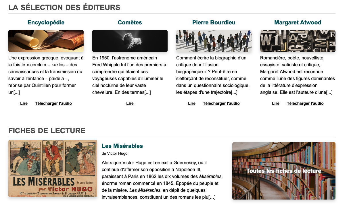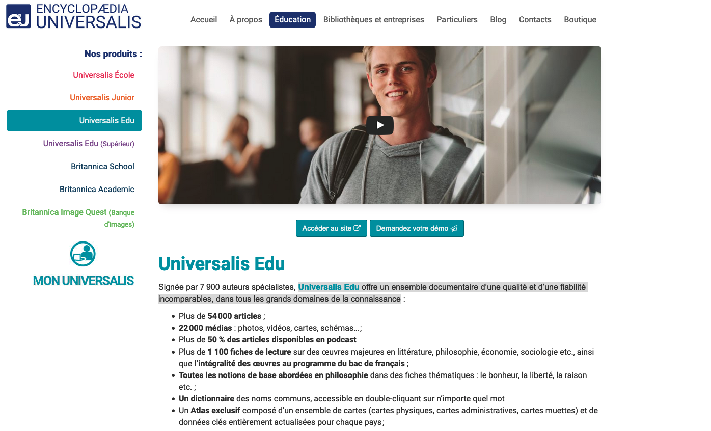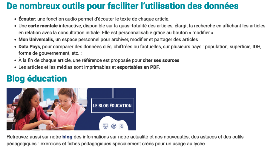 Universalis Edu offre un ensemble documentaire de grande qualité et de fiabilité dans tous les grands domaines de la connaissance. Les documents proposés sont variés (photos, vidéos, articles...) et elle propose des outils pour faciliter l’utilisation des données comme la fonction audio ou la carte mentale.