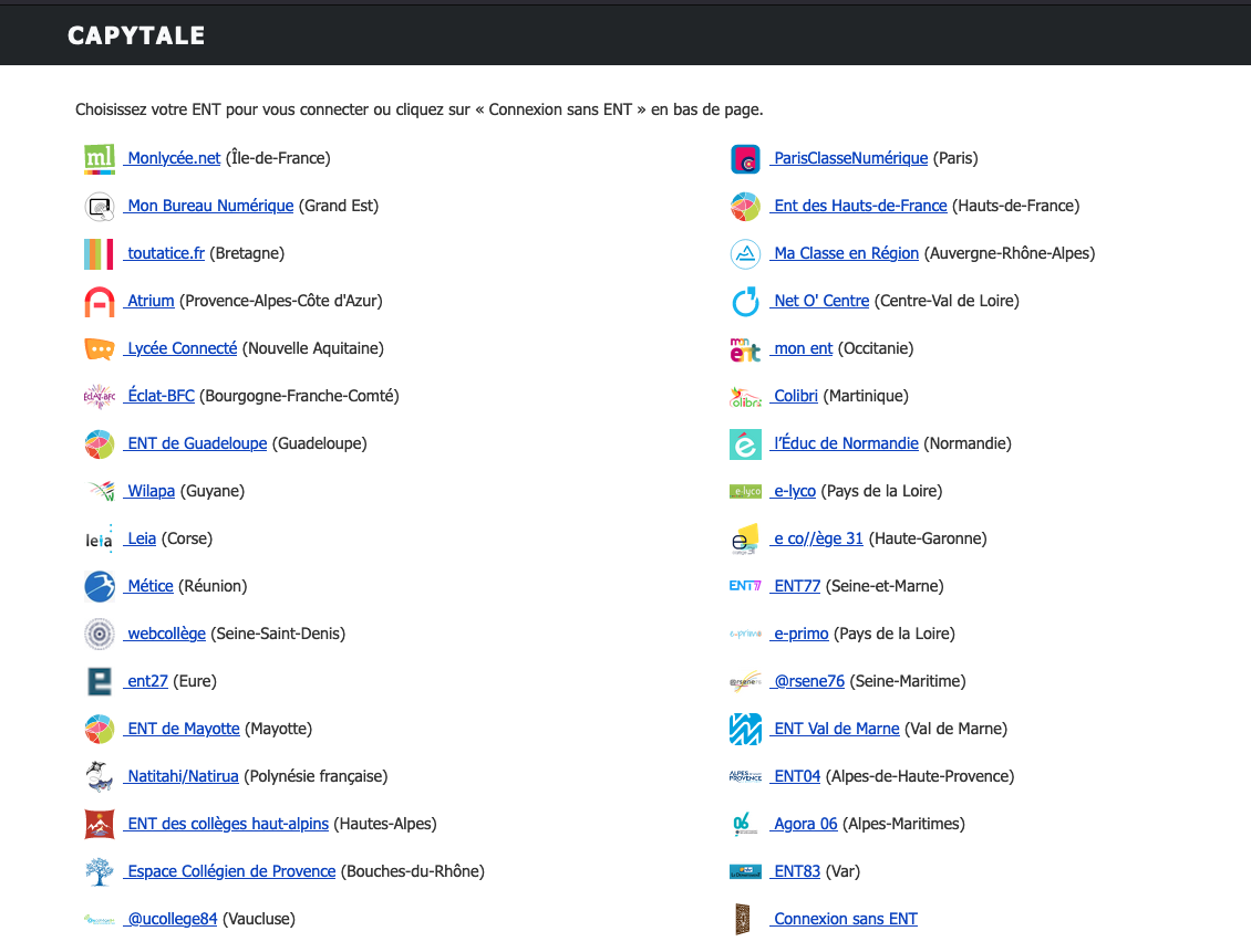 Choisissez votre ENT pour vous connecter ou cliquez sur « Connexion sans ENT » en bas de page.