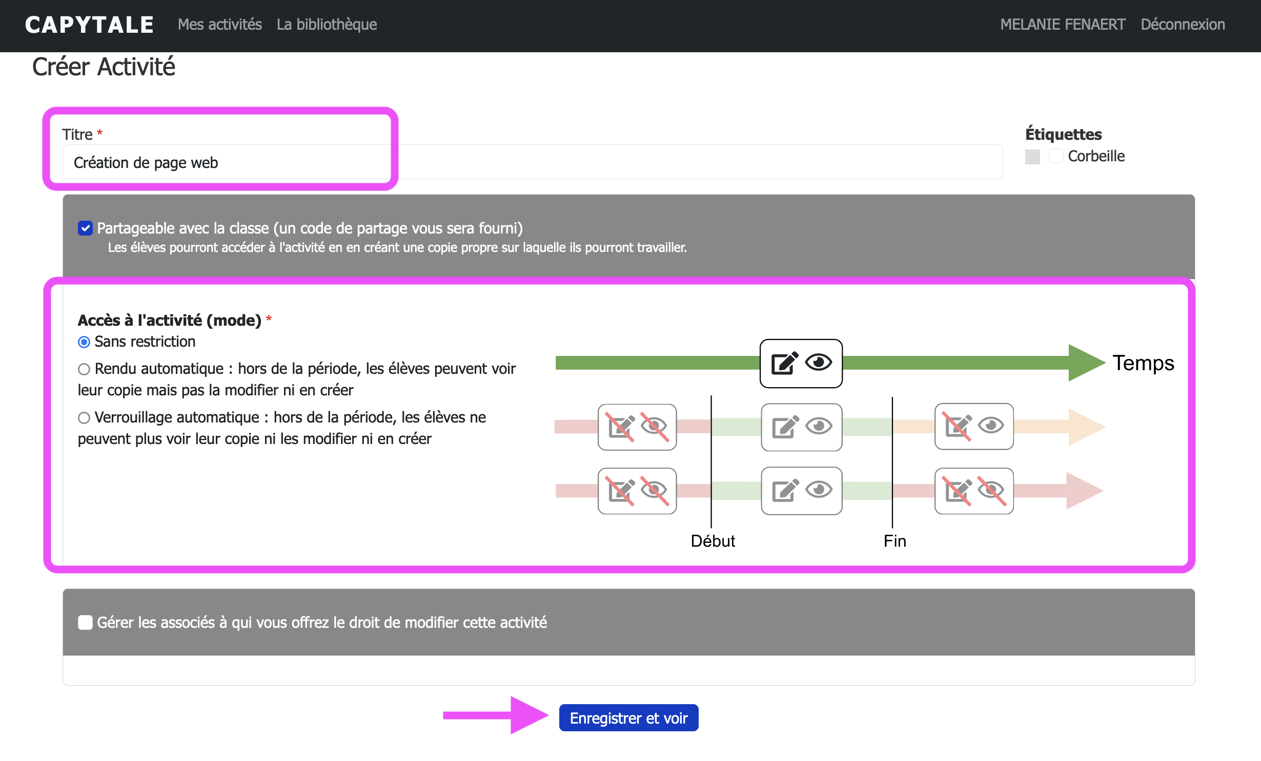 La page de création de l’activité demande un titre, permet de choisir le mode d’accès à l’activité pour les élèves, ainsi que des associés.