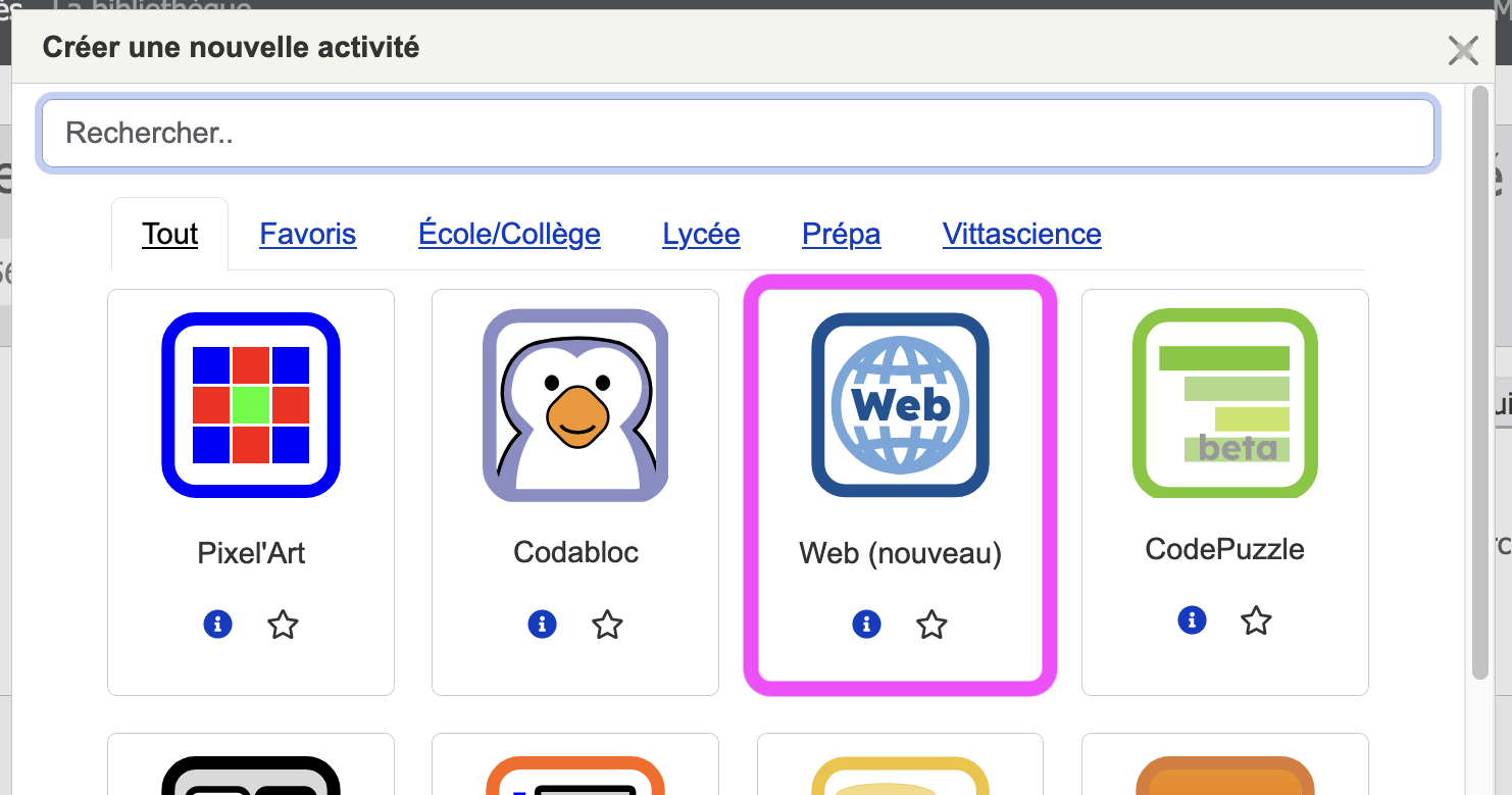 Dans le bandeau supérieur, cliquer sur Créer une activité, puis sélectionner le module Web.
