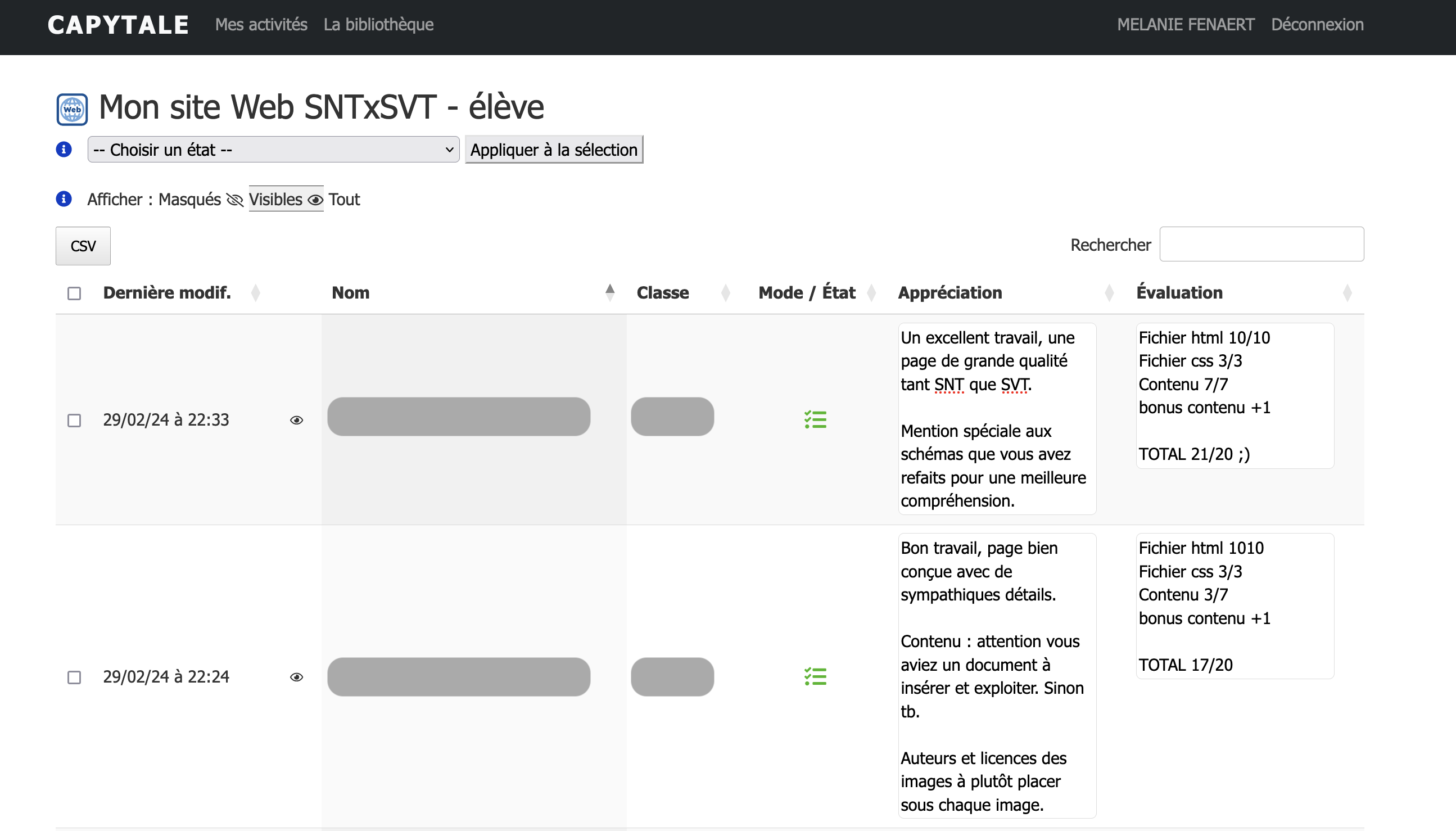 Capture du tableau de bord, avec les appréciations et notes de deux élèves.