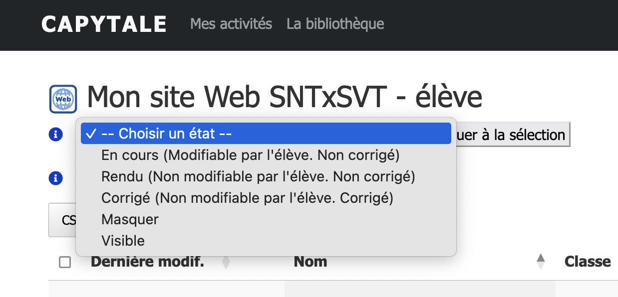Capture du tableau de bord de l’enseignant, zoom sur la barre de filtrage "Choisir un état" et son menu déroulant : en cours, rendu, corrigé, masquer, visible.