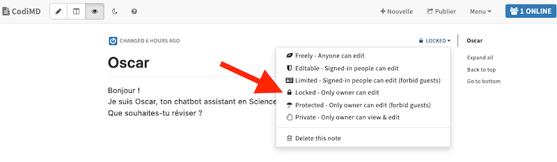Un pad CodiMD peut être utilisé pour de la rédaction collaborative, ce qui est intéressant si le chatbot est un projet d’équipe. Cependant, il peut aussi être accessible à toute autre personne, selon le degré de visibilité qu’on lui donne (et donc potentiellement modifié ou supprimé !).